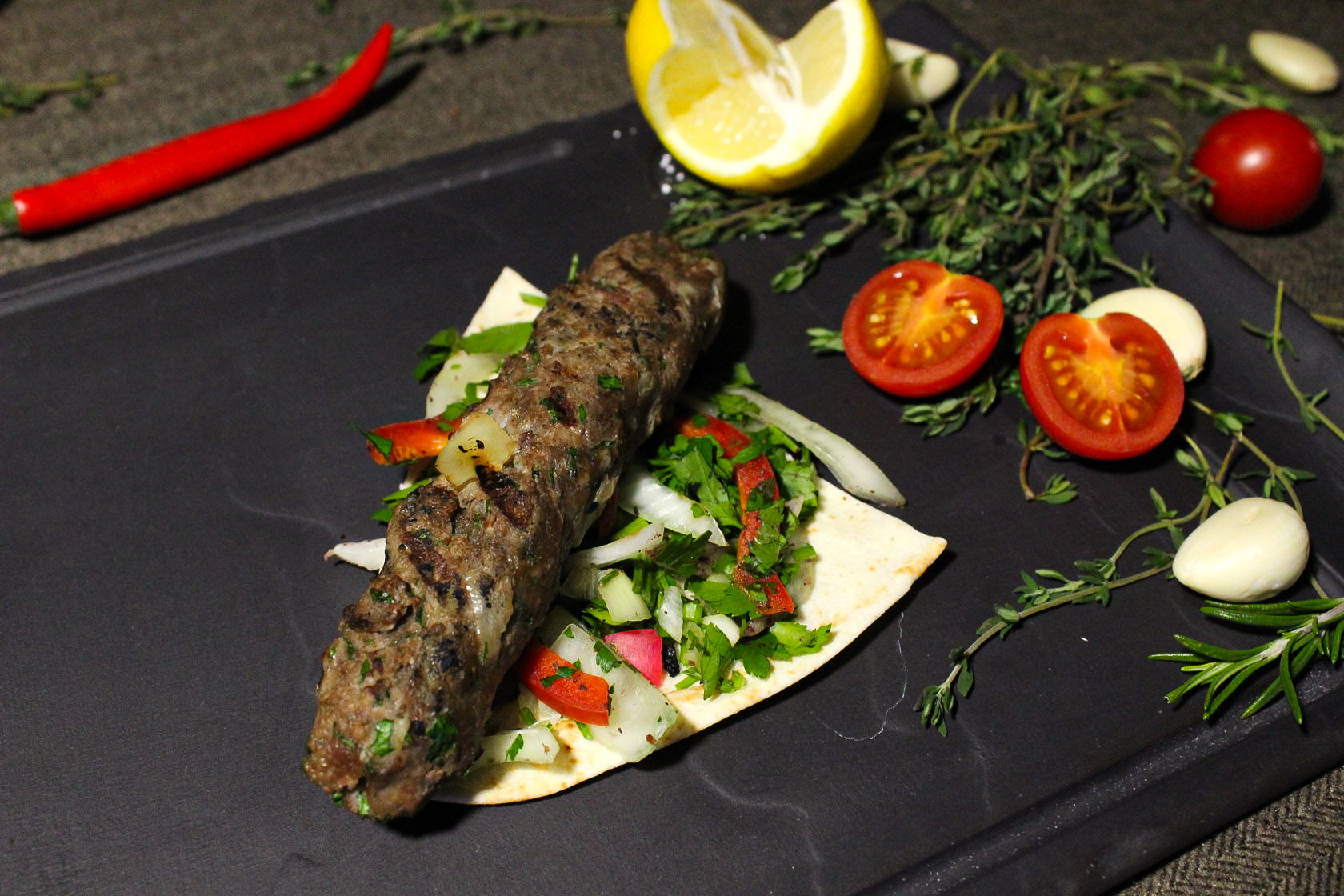 1 Brochette de viande de bœuf hachée avec du persil.