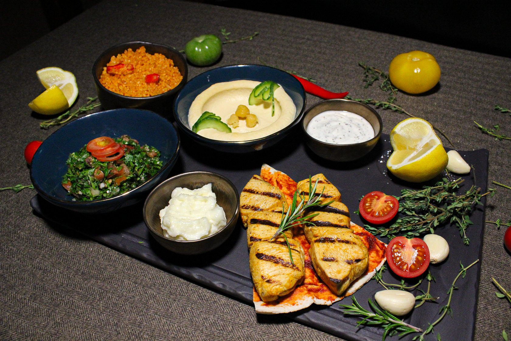 Taouk accompagné de taboulé, hommos, moutabal, falafel, feuille de vigne et de blé concassé ou de frites.